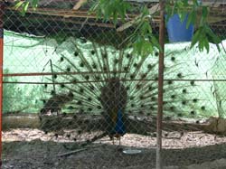 pequeña granja, con gallinas, pollos, patos y un magnífico pavo real, que